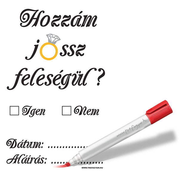 Lánykérésre készülsz? Tűnj ki a tömegből, és kérd meg stílusosan, ám szokatlanul párod kezét. Viseld ezt a pólót, és hagyd, hogy kedvesed észrevegye rajtad az üzenetet. De ez még nem minden. A kérdésre választ is kell kapnod. Ha szerencséd van, az "IGEN" mezőt fogja megjelölni, majd a dátum és párod aláírása is a pólóra kerül. Az ilyen módon "kidekorált" póló örök emlék marad. Akár be is keretezhetitek.